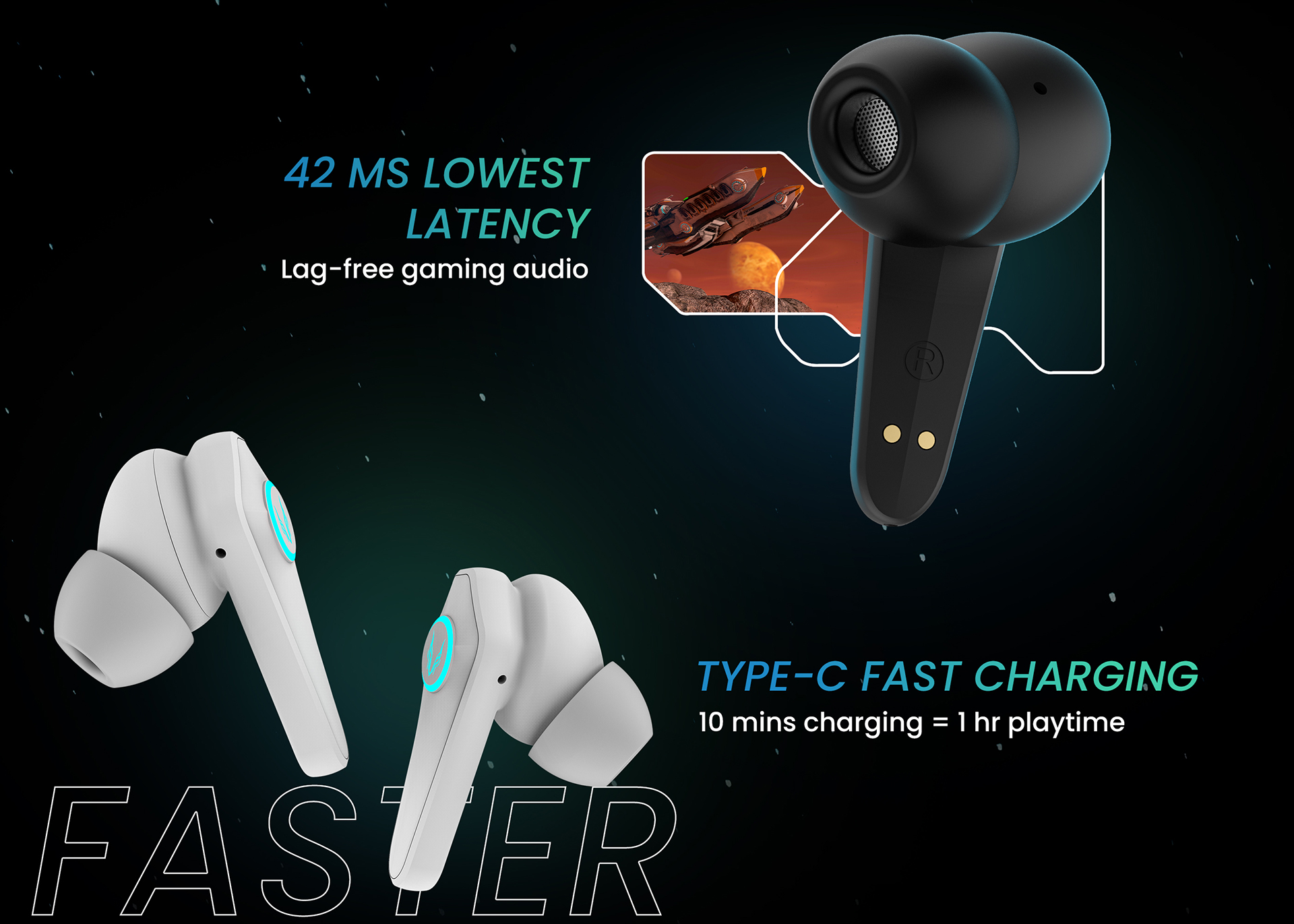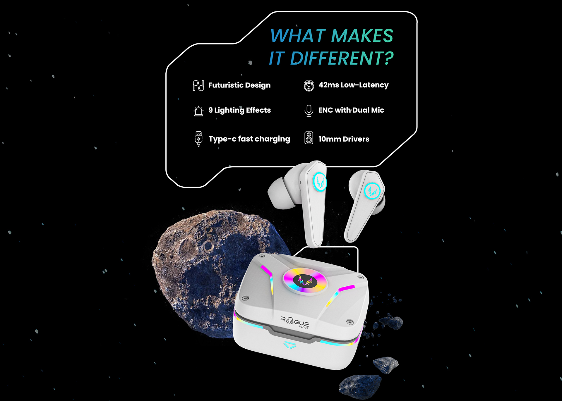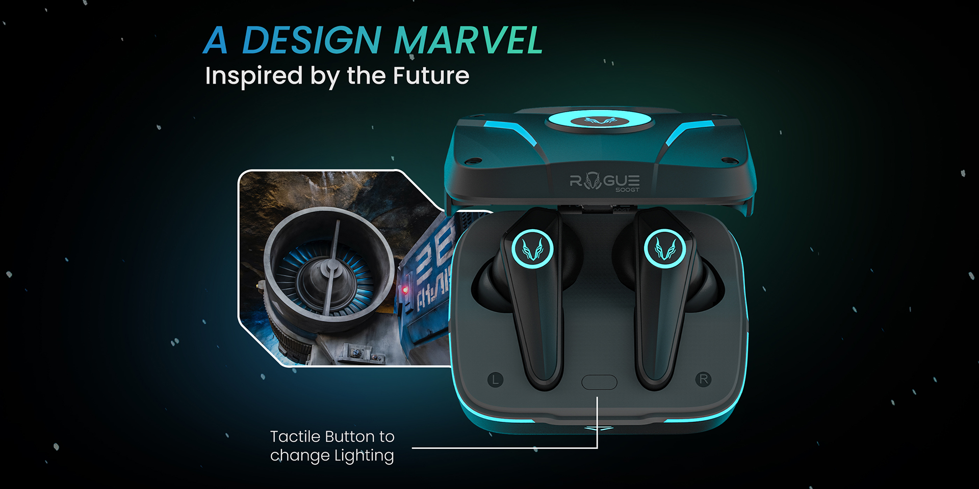 Rogue 500GT is India’s first gaming-true wireless earbuds designed for gamers who demand speed and style. With ultra-low latency (42ms), nine different RGB pulse lighting modes, and three built-in EQ modes—Gaming, BassX, and Balanced—it delivers immersive audio performance. The design combines futuristic aesthetics with ergonomic build and distinct branding to stand out in a competitive market.