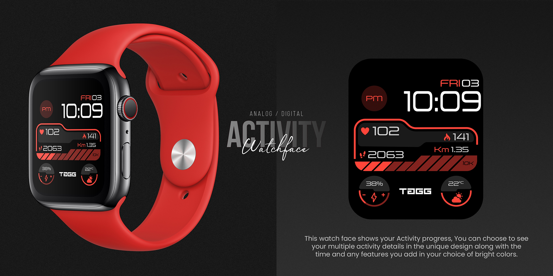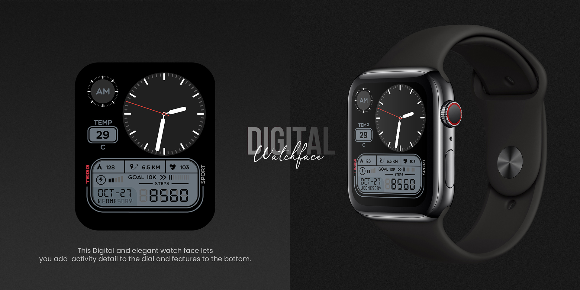 The watchface blends classic analog aesthetics with modern activity tracking. Users can choose between overlapping Activity rings or sub-dial layouts for flexibility, while bold, oversized typography ensures quick readability. A clean layout, balanced spacing, and realistic renders highlight how the design adapts seamlessly to both everyday wear and active use.